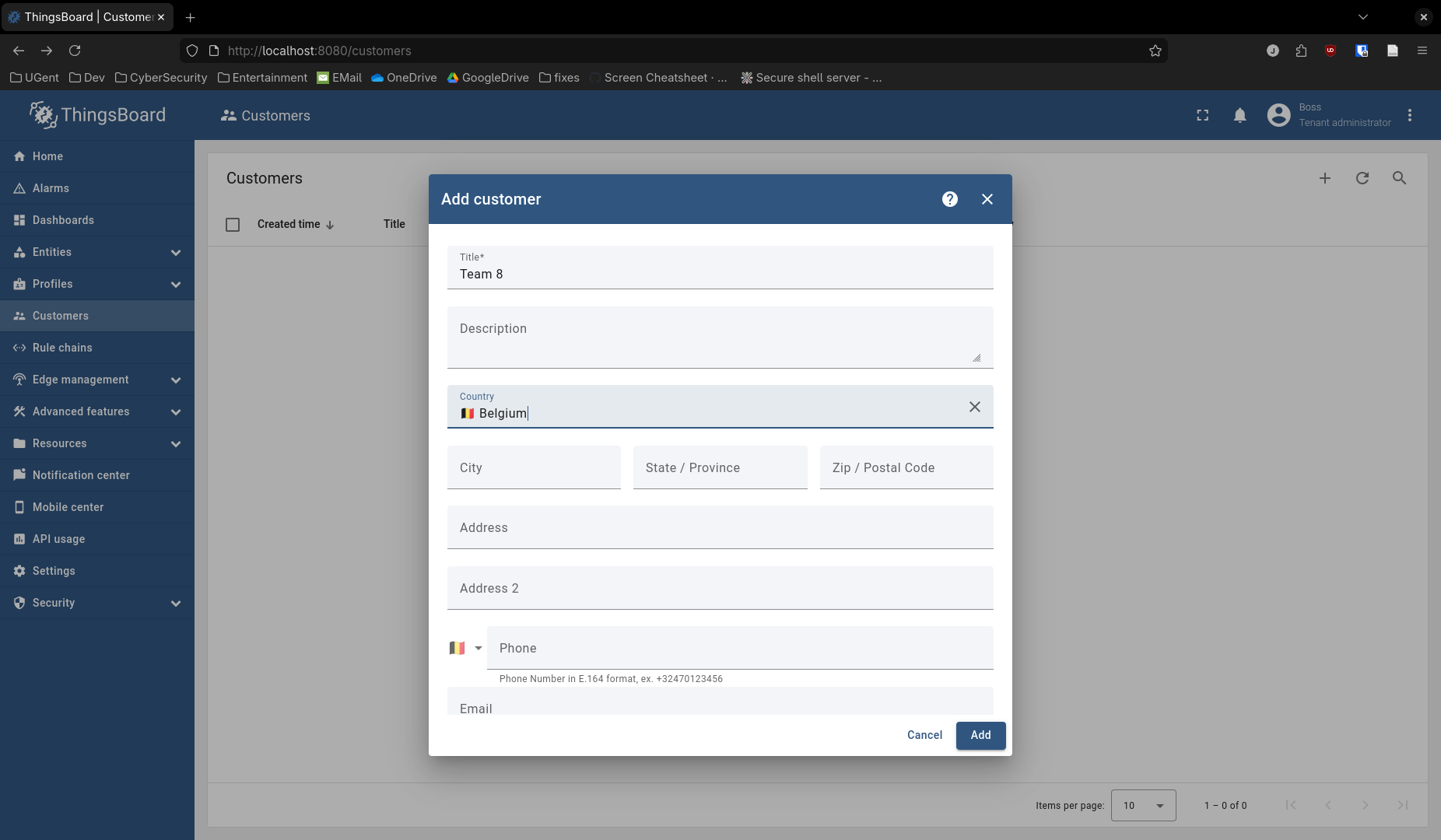 This creates an empty dashboard, which we will fill in the next section. Don't forget to save when leaving the page! The only thing left to do is to add a device to our customer. Navigate to Entities/Devices and click Add device.